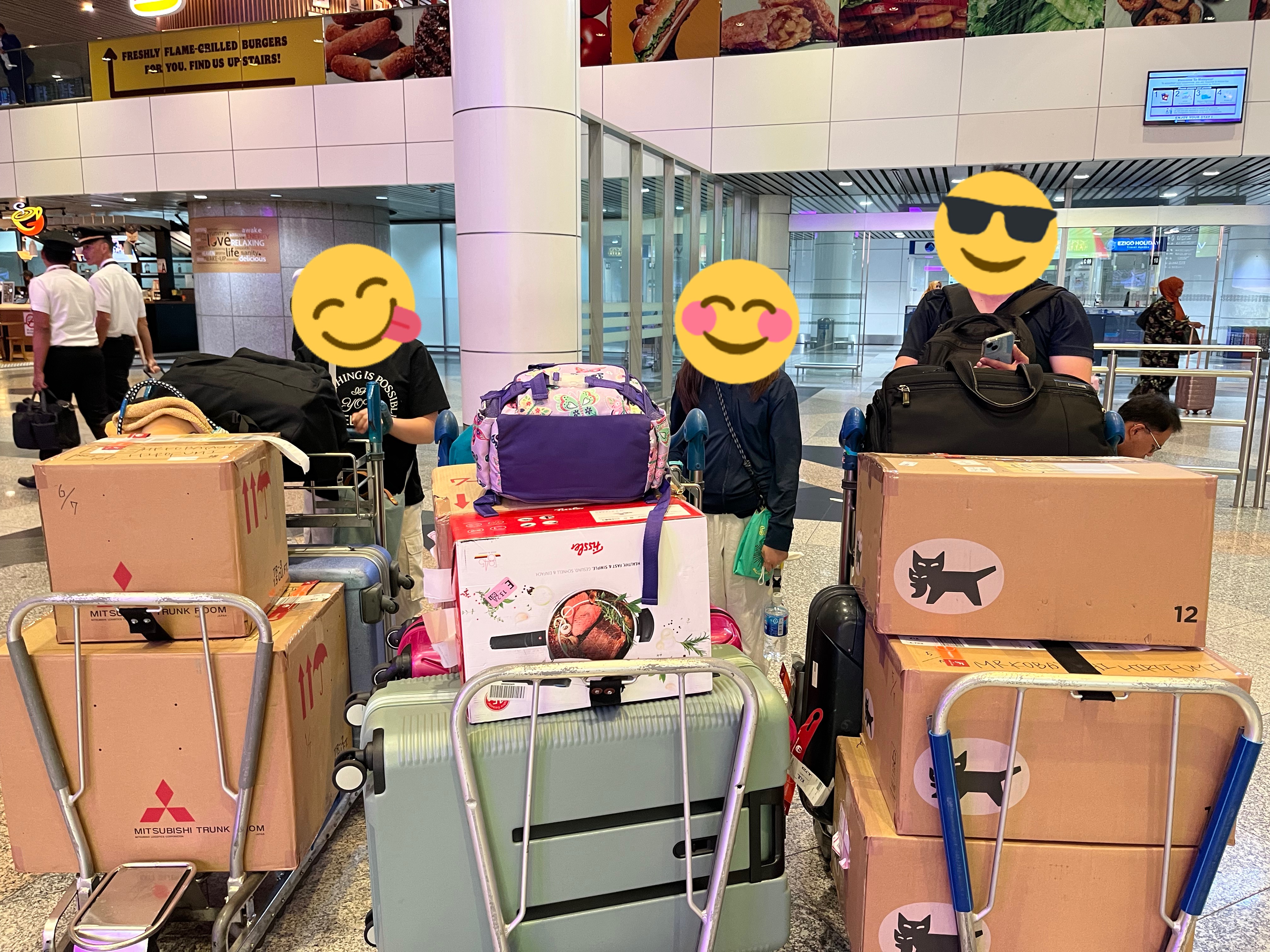 10月8日早朝、成田のホテルを後に、日本滞在中に持っていたスーツケース2つと機内持ち込み用の小さいスーツケース、各自リュックを背負って、成田空港へと向かいました。成田へ送っていた他のスーツケース2つと、段ボール7箱を宅急便カウンターへピックアップしに行きました。段ボール箱の多さに、インバウンドの方に間違われるのでは…と思うほど…。まずは航空会社のカウンターへチェックインしに向かいました。家族4人分のスーツケースとその他段ボール7箱…あまりの荷物の多さに、空港スタッフの方も目を丸くしていました。なぜ、こんなに荷物が多くなったのかと言うと、マレーシアに着いてからは、1か月ほど航空便が来ないので、滞在するレジデンス(2週間)や引越先のレジデンスでも自炊の必要があり、そのためキッチン用品や調理器具、圧力鍋(米も炊けるし何かと便利かな?と思ったため)調味料やふりかけや米、ちょっとした食品、衣服や薬、洗濯用品、物干しなど、本当に必要かどうかの判断が日本にいる間は出来かねたので、闇雲に持って来た結果、段ボール7個になってしまったのです。ちょっとしたパニックですね。そんな感じで、大量の荷物と一緒に民族大移動のような外観でした。空港はそこまで混んでなかったので、割とすんなり出国ゲートまで来てしまいました。空腹だったため、みんな一目散に空港ラウンジへ向かい、全集中で朝食を食べた後、免税店などを少しウロウロしていると、あっという間に出発時間になってしまいました。もっとラウンジ堪能しとくんだった…なんて呑気な事を考えながら飛行機に乗り込むと、急に寂しさと不安を感じました。自分でも、「遅っ!」と思いましたが、もう仕方がありません。私の気持ちをよそに、さっさと飛行機が飛び立つと、先ほどのセンチメンタルな気持ちは何処へやら…さっそく機内食や映画にすっかり気持ちを奪わてしまいました。