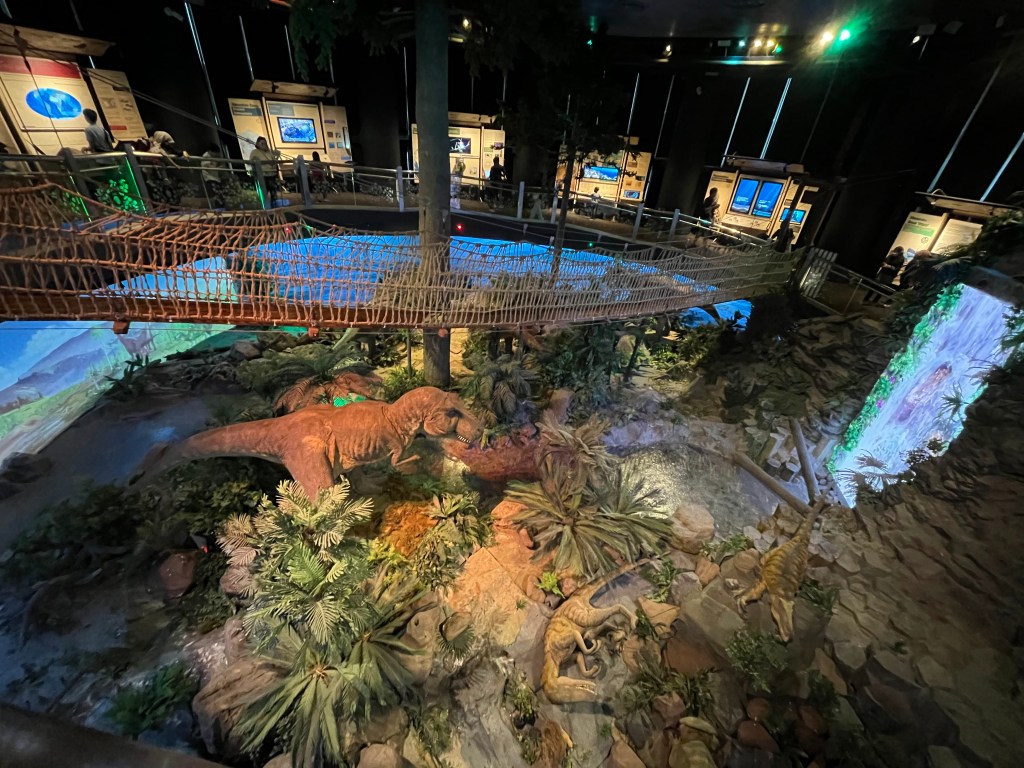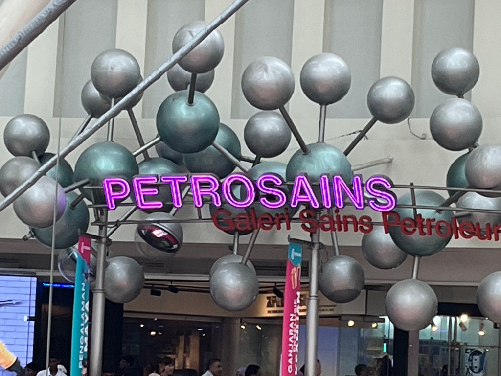 KLCC公園を散策後、SURIAというショッピングモールの最上階に、紀伊国屋書店とニトリが入っていました。そのフロアに「PETROSAINS(ペトロサインス—SAINSはマレー語で科学の意)」というマレーシア国営石油企業「PETRONAS(ペトロナス)」傘下の体験型科学博物館がありました。約7000平方メートルというとても広い科学博物館です。あまりに広いのでじっくり見ていたら半日は優にかかると思います。私たちも気軽に行ってみたのですが、駆け足で見ても2時間ほどかかってしまいました。初めは少し小さい子用の体験型の物が多く(地震体験できる椅子とか、てこの原理を理解する展示等)があり、その後、石油掘削現場、リグの櫓の再現や、掘削機械、どのようにして石油を取るかなど、詳しく展示してあり、リグの櫓の中を探検したり、様々な体験ができる装置が沢山ありました。娘たち(小6と中2)でも全然楽しめたので、幅広い年齢の方にお勧めです。石油の後はペトロナスがスポンサーをしていたF1の展示があったり(かっこいい!)、自然科学の展示、恐竜の展示などもありました。恐竜は実物大の物が展示されていて、さらに動いたり吠えたりするので、小さい男の子がとても怖がって「絶対に行かない!!」と泣いていました。男の子には気の毒ですが、可愛かったです。最後は曲がりくねった滑り台があって、袋を履いて滑るのでとてもスピードが出るらしく、娘たちは小さい子に交じって楽しんでました。