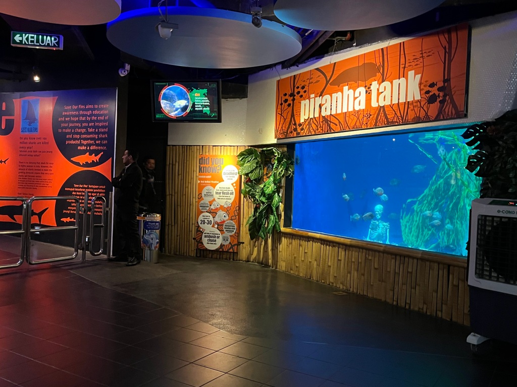 KLCCにいる間に水族館にも行ってみよう!という事になり、子供と私、3人で行ってみることにしました。上記の写真はエントランスです。ピラニアと骸骨がお出迎えしてくれます。外国に来たな、と思わせる演出です。水族館なのですが、なぜかミーアキャットや昆虫、カメレオン等の展示もありました。マレーシアと言えば巨大昆虫ですが、あまり見たくないなぁ…と思いながらも怖いもの見たさでちらっと見てしまいました…やっぱり見なければ良かった…。特に巨大しましまG…昆虫好きの方は嬉しいと思います。