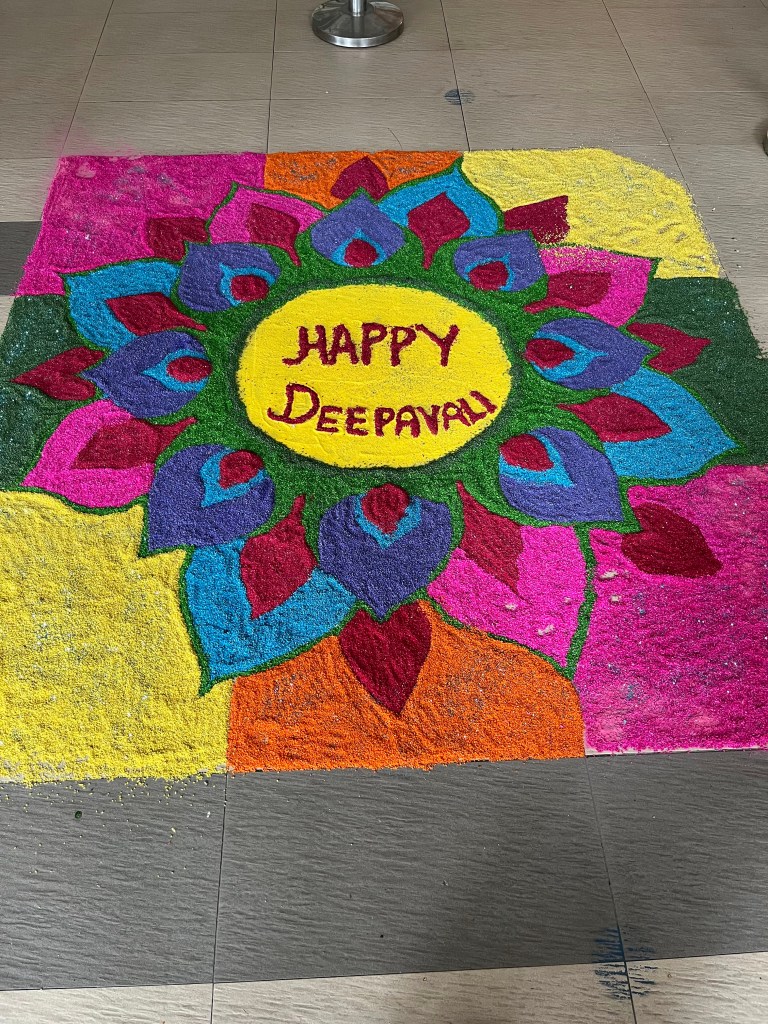 まず、「Deepavali (ディーパバリ)」とは、「ディーワーリ」などとも呼ばれ、ヒンドゥー教の最大のお祭りなのだそうです。別名「Festival of Light (光の祭典)」とも呼ばれ、由来には諸説あるようですが、一般的なものとしては、悪に対する善の勝利(闇に対する光の勝利)をお祝いする行事だそうです。この時期、あちこちに色鮮やかな砂絵(米絵)が飾られていて、大型ショッピングモールや学校にもこの砂絵がありました。
