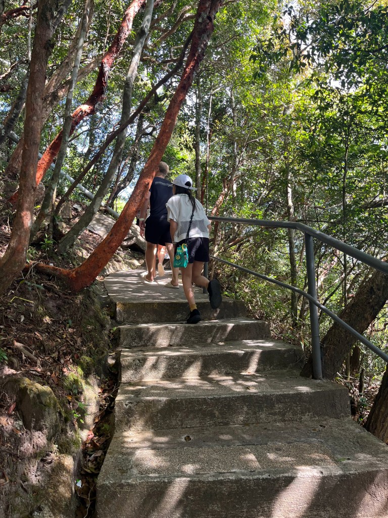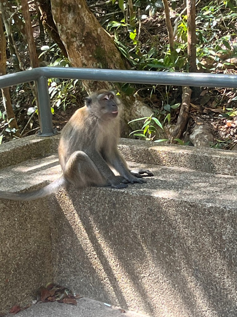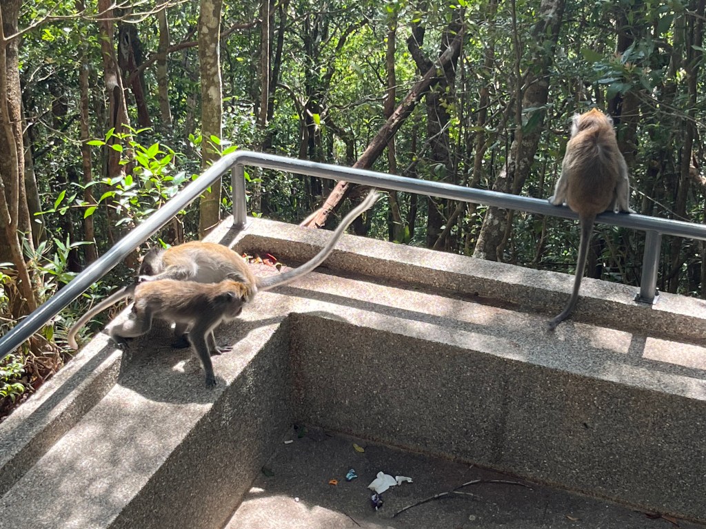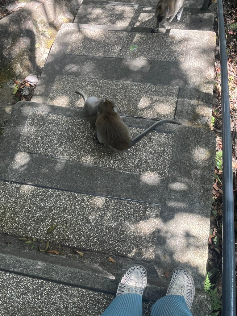 2つ目のケーブルカーを降りると、さらに小さな乗り物(10人ほど立って乗ってました)に乗るか、10分ほど森の中を歩いて行くか、どちらかの方法で行かねばならず、小さな乗り物の列がひどいので、歩いて行くことにしました。これまた結構な急こう配で大変でしたが、猿が沢山いて足のすぐそばまで来てくれたりするので、可愛かったです。ですが、この種類の猿はかなりアグレッシブで、人間が持っている食べ物や飲み物を奪いに来たりするので、注意が必要でした。