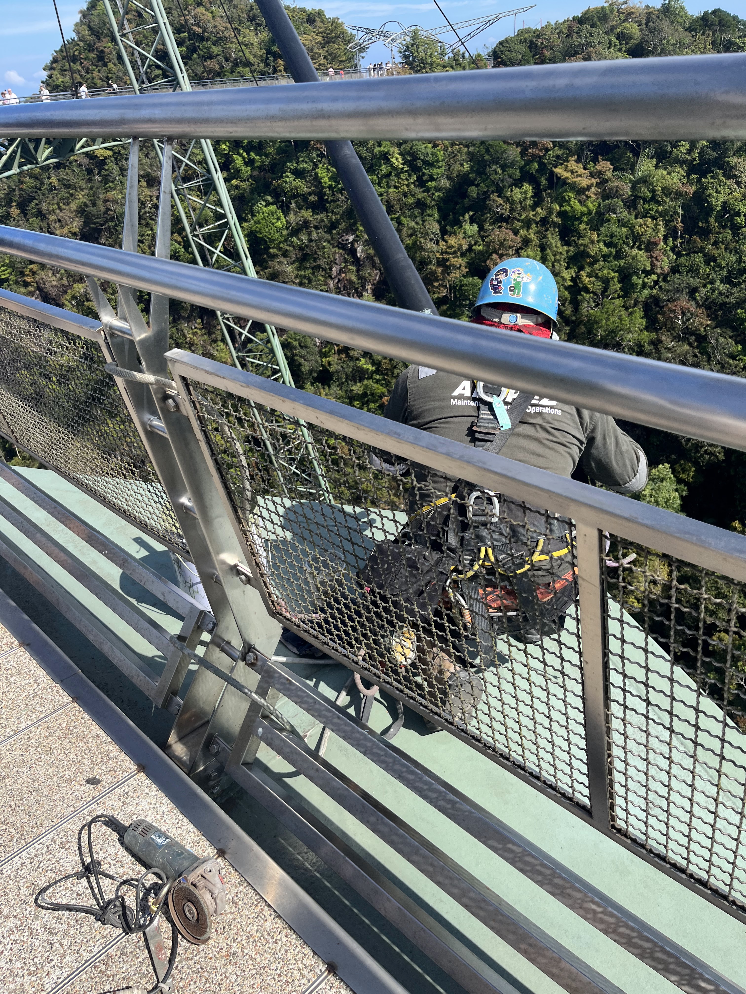 スカイブリッジに着きました!が!高い!揺れる!怖い!高い所が苦手だったのを今更思い出しました。しかも、橋の外側で作業されている方が!ひーーーー!足元が所々ガラスで下がスケスケでとてもじゃないけど私は立てませんでした…。でも、景色は本当に綺麗で、ディズニーの「モアナ」に出てきた「ティフィティ」みたい!と、子供達は喜んでいました。
