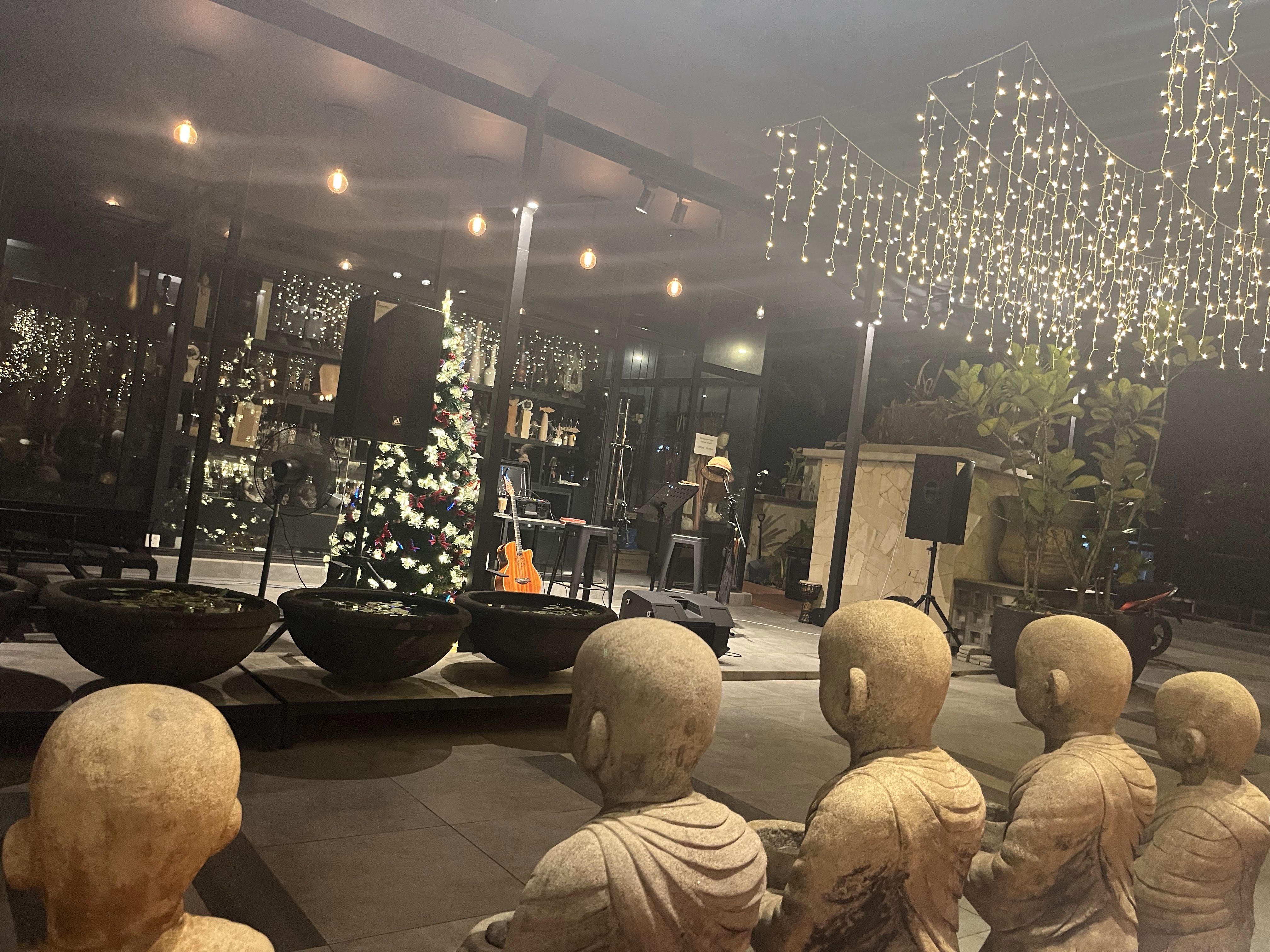 お地蔵様の後頭部を眺めながら夕食です。通路の向こう側にバンドさんが来て、色々演奏してくださいました。料理はステーキやピザ、サラダ等がある西洋料理でした。すみれは大好きなピザとサラダに生バンド演奏と、昨日とは打って変わって大満足でした。やはりこういうのが好きなのね。ご機嫌で良かった良かった。この日は12月31日だったので夕食後、部屋で持って来たPCを部屋のテレビと繋げ、NHKの紅白歌合戦を見ました。若い出演者は子供の解説がないと分からない人達ばかりで、本当に歳取ったな~と思いました。主人は分からなすぎて途中から寝てしまい、「ゆく年くる年」の時だけ起きてきました(私もこれが見たかった!)先ほどのレストランでは12時前からカウントダウンが始まり、バンドさんの演奏もあって大盛り上がりでした。どこかで花火も上がり(私達のベランダからは、ちょうどヤシの木が邪魔で見れませんでした)NewYearって感じです。実は昨夜もレストランでどんちゃん騒ぎをしていて、私はちょっとうるさくて寝不足気味に…。年末年始は家でまったり過ごすのが性に合ってるのかもしれません(歳?)